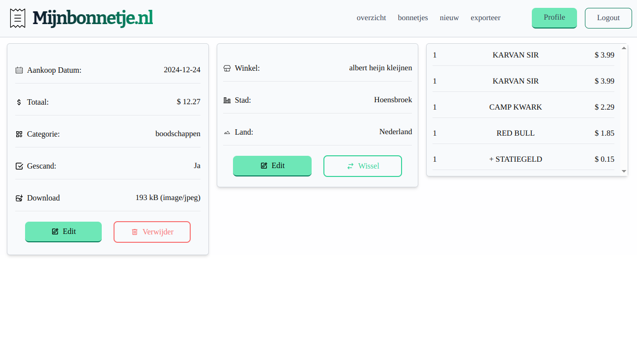 De applicatie maakt het mogelijk om fysieke bonnetjes te scannen, de gegevens automatisch uit te lezen met Optical Character Recognition (OCR) en deze vervolgens op te slaan in een database. Gebruikers krijgen een handig overzicht van hun uitgaven per maand en kunnen bonnetjes filteren op winkel, categorie of scanstatus. Ook kunnen gegevens worden geëxporteerd voor verdere analyse.